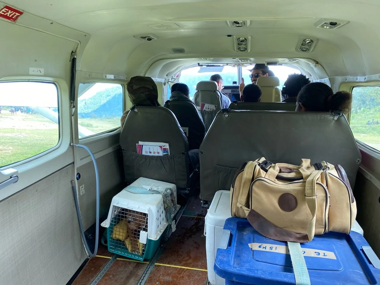 Eventually we headed home to the bush, but there were people who wanted to be dropped at Bak, an airstrip about 40 minutes from Mt Hagen, along the route to Telefomin, so we dropped them off there first. Ryan gets to visit bush airstrips every day that he’s flying, but Shiv doesn’t get to go quite so often. This was also Koda’s first visit to a bush airstrip. The people were very surprised to see a dog get out of the plane and have it walk around attached to a rope.
