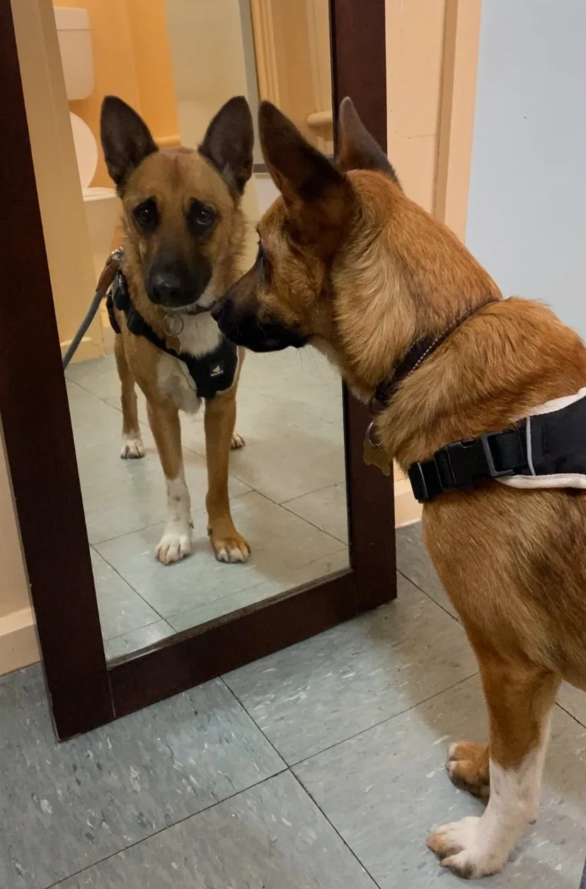 Whilst waiting to board, Koda had to accompany Shiv to the ladies’ room, where he encountered a handsome puppy in the mirror!